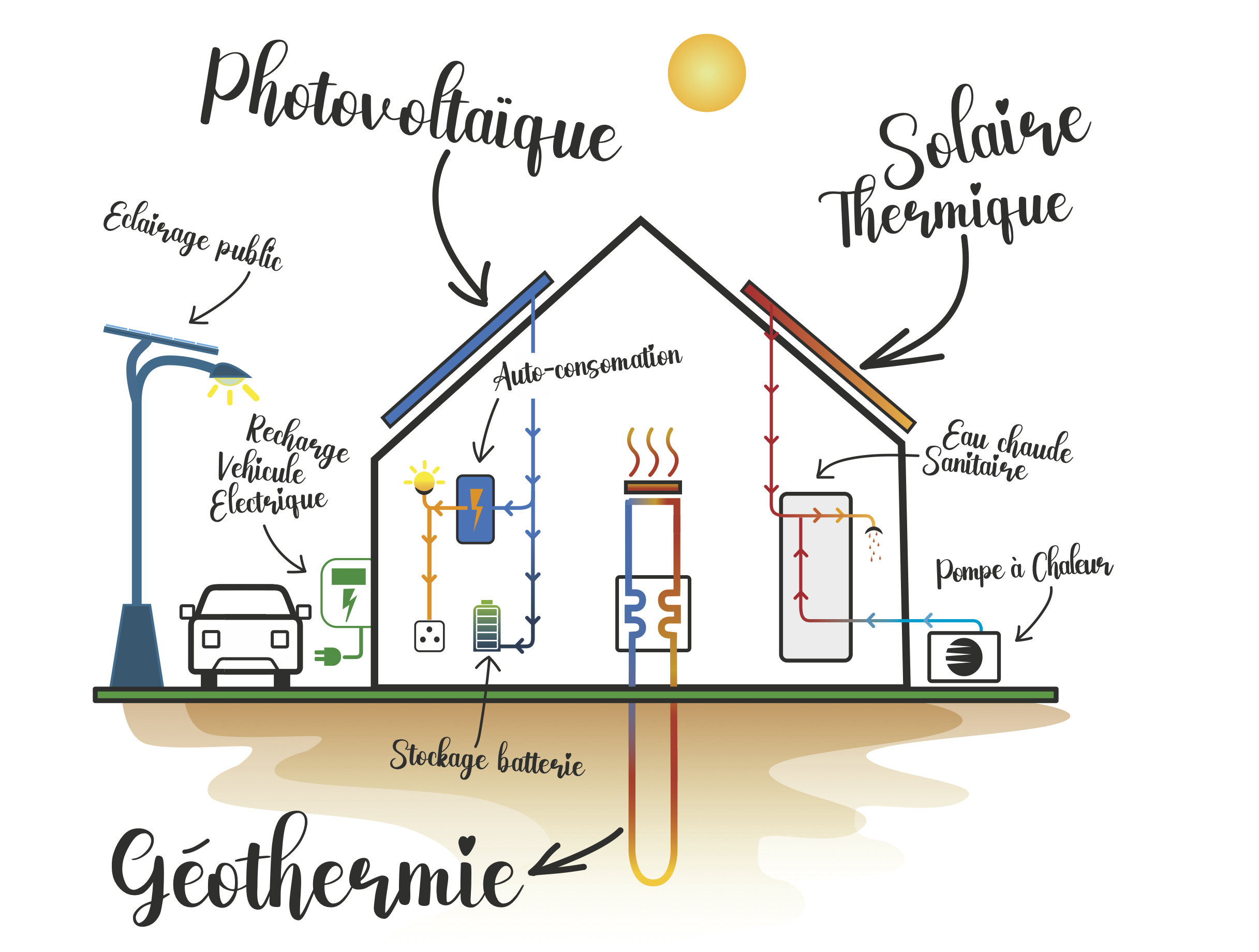 Grâce à des capteurs enfouis dans le sol, cette énergie est récupérée et restituée via une pompe à chaleur géothermique, sans combustion ni émission directe de CO₂.